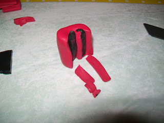 Ho inserito due rotolini di fimo nero all'interno e li ho distanziati con fimo rosso. Ho inserito due rotolini rossi sul nero.